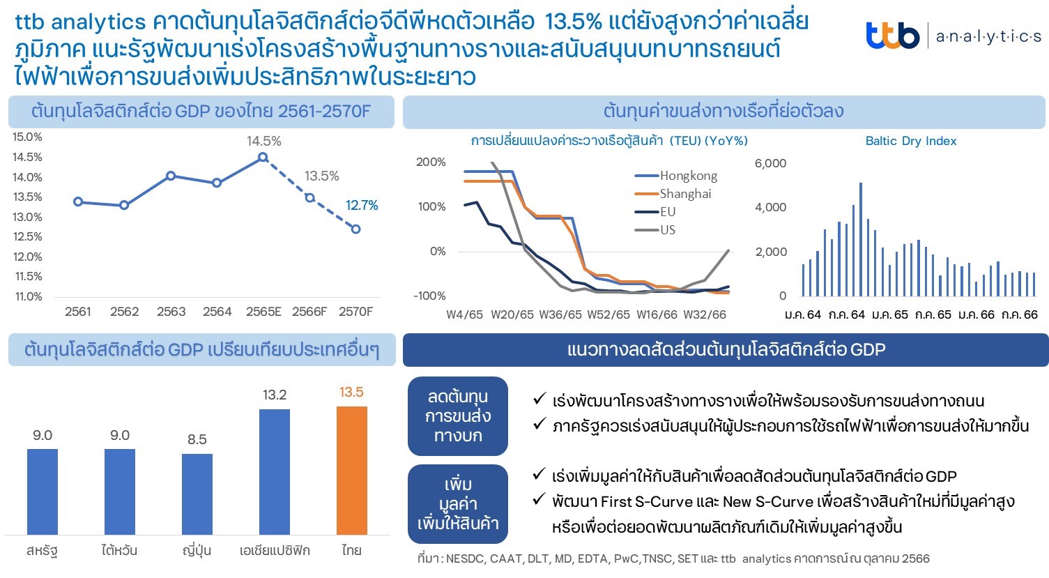ศูนย์วิเคราะห์เศรษฐกิจ ทีทีบี หรือ ttb analytics ประเมินสัดส่วนต้นทุนโลจิสติกส์ต่อจีดีพีปี 2566 ปรับลดเหลือ 13.5% จากค่าระวางการขนส่งทางเรือที่ปรับลดแรงจากฐานที่สูง และต้นทุนค่าขนส่งทางถนนที่เริ่มทรงตัวจากที่เพิ่มในอัตราเร่งจากปีก่อนหน้า ทั้งนี้ คาดปี 2567 สัดส่วนต้นทุนโลจิสติกส์ต่อจีดีพีมีแนวโน้มปรับเพิ่มเล็กน้อยจากค่าระวางเรือที่อาจขยับตัวเพิ่มจากการเริ่มฟื้นตัวของภาคส่งออก แนะภาครัฐเร่งพัฒนาโครงสร้างพื้นฐานระบบรางและสนับสนุนการใช้รถยนต์ไฟฟ้าในการขนส่งในการลดต้นทุนการขนส่งทางถนน และเพื่อลดสัดส่วนต้นทุนโลจิสติกส์ต่อจีดีพีให้ต่ำกว่าค่าเฉลี่ยของภูมิภาค