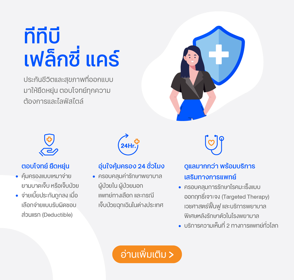 เราขอแนะนำ ทีทีบี เฟล็กซี่ แคร์ ประกันชีวิตและสุขภาพแบบเหมาจ่าย ที่ออกแบบมาให้ยืดหยุ่น สามารถตอบโจทย์ทุกความต้องการ และยังสามารถเลือกจ่ายค่าเบี้ยน้อยลงเมื่อคุณเลือกความคุ้มครองแบบรับผิดส่วนแรก (Deductible) โดยใช้สิทธิ์ร่วมกับประกันสุขภาพจากสวัสดิการที่ออฟฟิศให้อยู่แล้วได้ เพื่อให้มั่นใจว่าในอนาคตเราจะพร้อมรับมือกับทุกเหตุการณ์ไม่คาดฝันที่อาจเกิดขึ้นได้ และสามารถสร้างสมดุลชีวิตในทุก ๆ ด้าน รวมไปถึงสร้างชีวิตทางการเงินที่ดีเพื่อไปให้ถึงเป้าหมายที่คุณตั้งใจและใช้ชีวิตได้อย่างมั่นคง