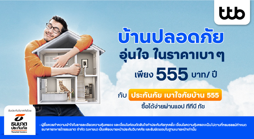 ทีเอ็มบีธนชาต หรือ ทีทีบี มุ่งยกระดับชีวิตทางการเงินของลูกค้ากลุ่มคนมีบ้านให้ดียิ่งขึ้น ตามกลยุทธ์ Home Ecosystem ที่ให้บริการครอบคลุมและเชื่อมโยงทุกด้านเกี่ยวกับเรื่องบ้าน ล่าสุด เปิดตัวผลิตภัณฑ์ “ประกันภัย เบาใจภัยบ้าน 555” เพื่อให้ลูกค้าที่เป็นเจ้าของบ้านมีแผนสำรองไว้อุ่นใจ เติมเต็มความคุ้มครองบ้านในราคาเบา ๆ ความคุ้มครองหลักแสน ด้วยเบี้ยหลักร้อย รับประกันภัยโดยบริษัท ธนชาตประกันภัย จำกัด (มหาชน) ลูกค้าซื้อได้ง่าย ๆ ด้วยตนเองผ่านแอป ทีทีบี ทัช