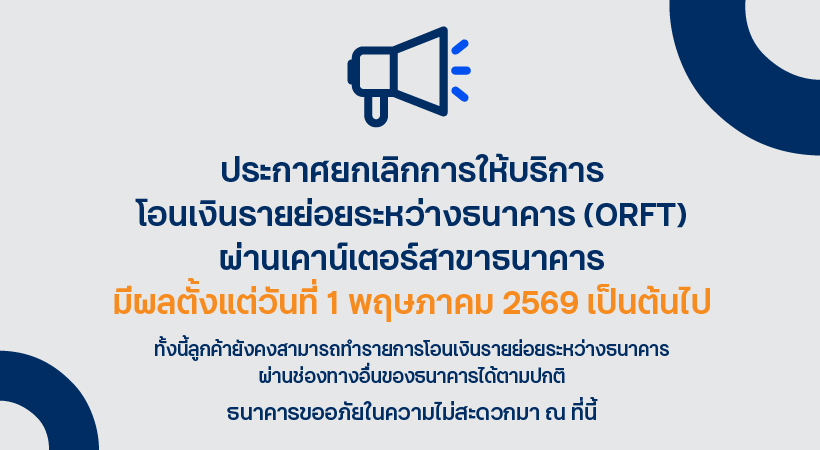 ธนาคารขอเรียนแจ้งยกเลิกการให้บริการโอนเงินรายย่อยระหว่างธนาคาร (ORFT) ผ่านเคาน์เตอร์สาขาธนาคาร