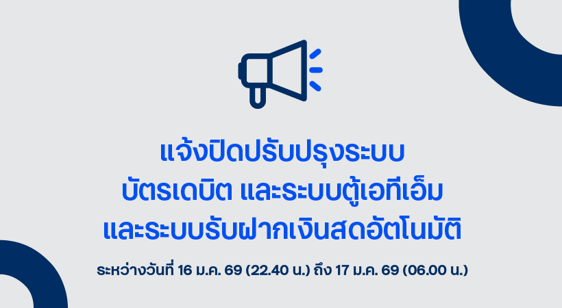 ประชาสัมพันธ์ปรับปรุงระบบเกี่ยวกับบัตรเดบิต และ ATM / CDM ในวันที่ 13 มกราคม 2569 เวลา 22.40 น. – 17 มกราคม 2569 เวลา 06.00 น.