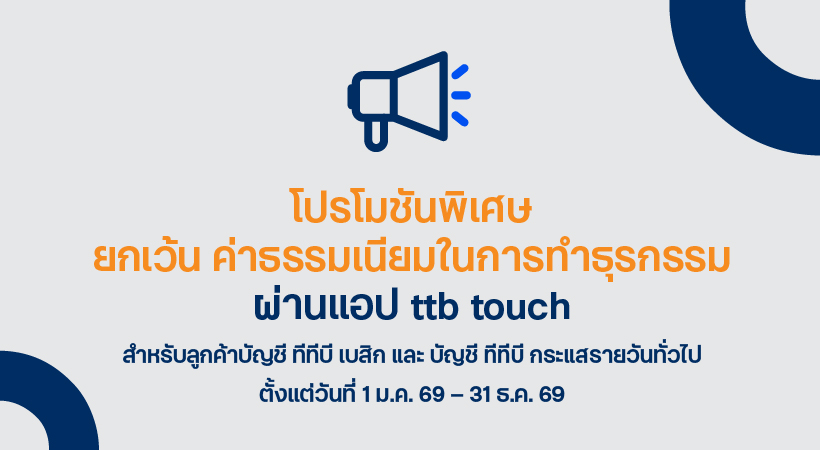ธนาคารขอเรียนแจ้งยกเว้นค่าธรรมเนียมการทำธุรกรรม ผ่านแอป ttb touch สำหรับลูกค้าที่ใช้ บัญชี ทีทีบี เบสิก และ บัญชี ทีทีบี กระแสรายวันทั่วไป ในการทำธุรกรรม ดังนี้