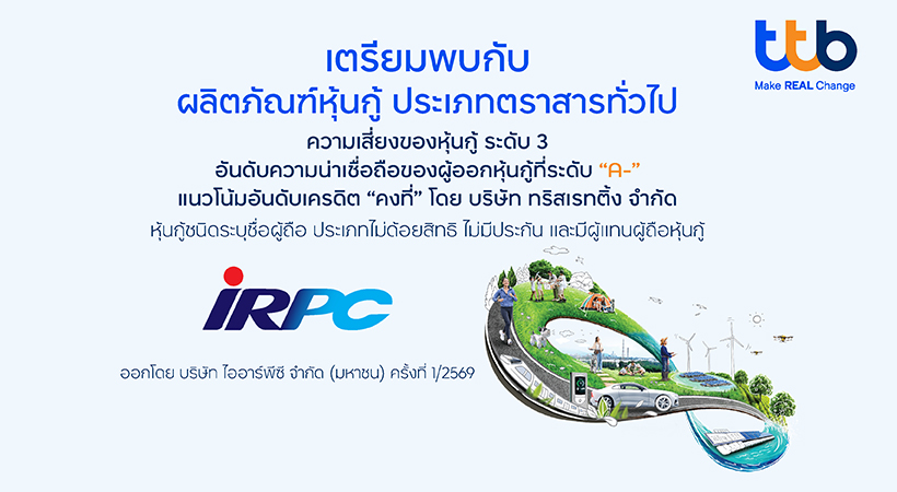 ทีเอ็มบีธนชาต หรือ ทีทีบี เป็นตัวแทนจัดจำหน่ายหุ้นกู้ทั่วไป ออกโดย บริษัท ไออาร์พีซี จำกัด (มหาชน) ซึ่งเป็นบริษัทที่ดำเนินธุรกิจปิโตรเคมีครบวงจร ที่มุ่งสร้างสรรค์นวัตกรรมการใช้วัสดุและพลังงานอย่างยั่งยืน พร้อมตอบโจทย์การใช้ชีวิตในอนาคต