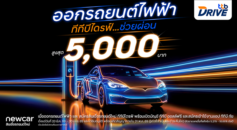 เพียงสมัครสินเชื่อรถยนต์ใหม่ ทีทีบีไดรฟ์ พร้อมเปิดบัญชี ทีทีบี ออลล์ฟรี และสมัครเข้าใช้งาน แอป ทีทีบี ทัช ตามเงื่อนไขที่กำหนด จะได้รับสิทธิ์ช่วยผ่อนชำระค่างวดสูงสุด 5,000 บาท จำนวน 1 งวด ซึ่งครอบคลุมรถยนต์ไฟฟ้าหลากหลายแบรนด์ชั้นนำที่ร่วมรายการ พร้อมข้อเสนอพิเศษอื่น ๆ อีกมากมาย ภายในงาน Motor Show 2026 ระหว่างวันที่ 23 มีนาคม – 5 เมษายน 2569 ณ อาคารชาเลนเจอร์ อิมแพ็ค เมืองทองธานี