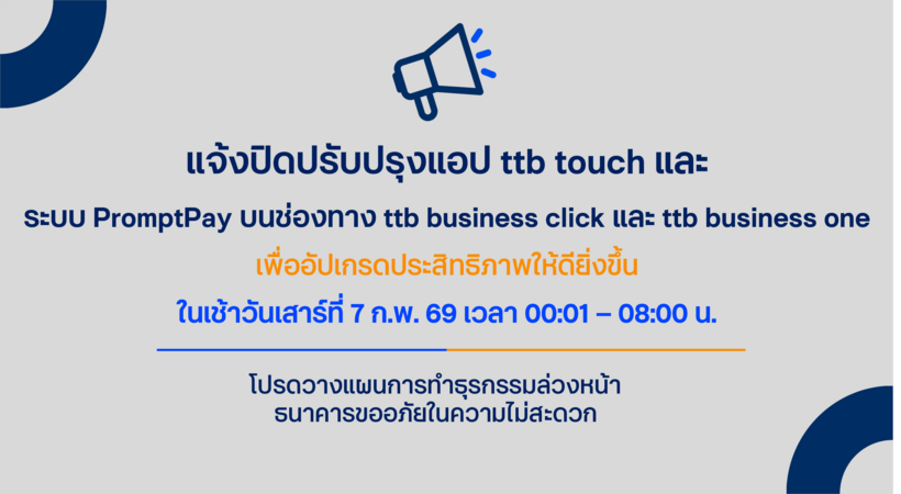 ttb จะปิดปรับปรุงแอป ttb touch และ ระบบ PromptPay บนช่องทาง ttb business click และ ttb business one