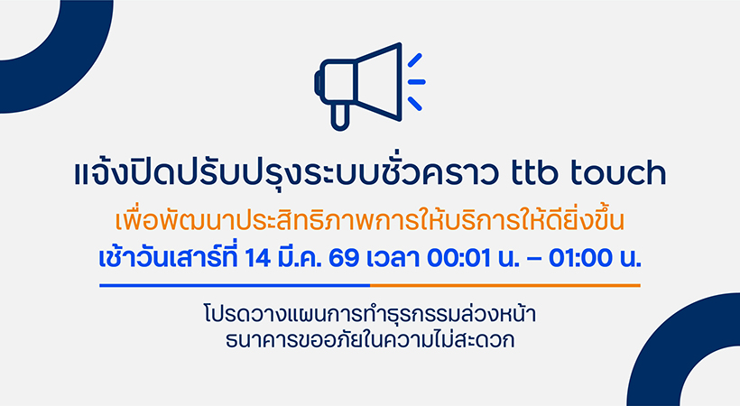 เพื่อพัฒนาประสิทธิภาพการให้บริการให้ดียิ่งขึ้น ธนาคารจะดำเนินการปิดปรับปรุงระบบแอป ทีทีบี ทัช ชั่วคราว ในเช้าวันเสาร์ที่ 14 มีนาคม 2569 เวลา 00:01 น. - 01:00 น.