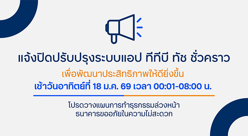 เพื่อพัฒนาประสิทธิภาพการให้บริการให้ดียิ่งขึ้น ธนาคารจะดำเนินการปิดปรับปรุงระบบ แอป ทีทีบี ทัช ชั่วคราว ในเช้าอาทิตย์ที่ 18 มกราคม 2569 เวลา 00:01 น.-08:00 น.