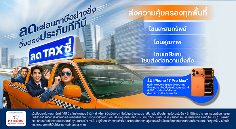 ทีทีบี ร่วมกับ พรูเด็นเชียล ประเทศไทย เปิดตัวแคมเปญ “ลด TAX ซี่” ลดหย่อนภาษีอย่างซิ่ง วิ่งตรงประกันทีทีบี มอบสิทธิพิเศษให้ลูกค้าที่เลือกซื้อผลิตภัณฑ์ประกันชีวิต ของ พรูเด็นเชียลฯ ที่ร่วมรายการ ไม่ว่าจะเป็นประกันชีวิตและสุขภาพ ประกันชีวิตสะสมทรัพย์เพื่อการออม หรือประกันชีวิตเพื่อการเกษียณ ตั้งแต่วันที่ 1 ตุลาคม ถึงวันที่ 31 ธันวาคม 2568 ที่สาขาทีทีบีทั่วประเทศ หรือผ่านแอป ttb touch ได้แก่