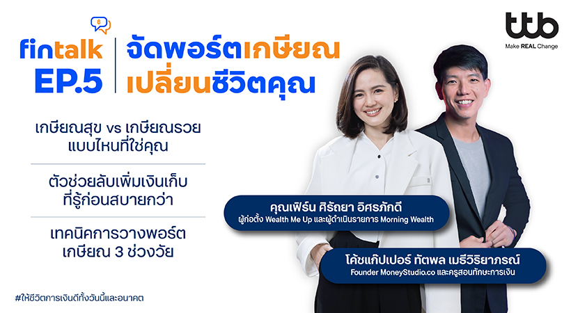 ทีเอ็มบีธนชาต หรือ ทีทีบี ชวนพนักงานเตรียมความพร้อมสู่ชีวิตหลังเกษียณ จัดกิจกรรม fintalk “จัดพอร์ตเกษียณ เปลี่ยนชีวิตคุณ” กับ “เฟิร์น - ศิรัถยา อิศรภักดี” พิธีกรและผู้ดำเนินรายการด้านการเงินคนดัง จากช่อง Wealth Me Up และคุณแก๊ปเปอร์-ทัตพล เมธีวิริยาภรณ์ เจ้าของสถาบัน MoneyStudio.co มาร่วมเปิดมุมมอง พร้อมพาไปสำรวจรูปแบบการเกษียณ ว่ามีเครื่องมืออะไรที่เป็นตัวช่วย และที่สำคัญจัดพอร์ตการลงทุนอย่างไรให้เป้าหมายเป็นจริง