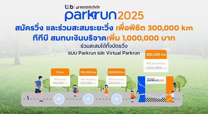อย่ารอช้า! ทุกก้าววิ่งของทุกคนมีความหมายในงาน “ทีทีบี | ธนชาตประกันภัย พาร์ครัน 2025” โดย ทีทีบี ร่วมกับ พันธมิตรหลัก ธนชาตประกันภัย ชวนคนไทยร่วมกันวิ่งสู่เส้นชัยแห่งการให้...ไม่มีสิ้นสุด พร้อมพิชิตภารกิจพิเศษ! ร่วมกันวิ่งสะสมระยะทาง ในสถานที่และเวลาที่สะดวก เพื่อเปลี่ยนทุกก้าววิ่ง เป็นโอกาสให้เด็กและเยาวชนไทยมีคุณภาพชีวิตที่ดีขึ้น โดยทีทีบีร่วมจะสมทบเงินบริจาครวม 1 ล้านบาท เมื่อผลสะสมระยะทางวิ่งทั้งหมดครบ 300,000 กิโลเมตร ซึ่งนักวิ่งที่ซื้อบัตรวิ่งไปแล้ว ทั้งแบบ Parkrun และ Virtual Parkrun สามารถร่วมส่งผลสะสมระยะทางวิ่งได้บนเว็บไซต์ parkrun.ttbfoundation.org ถึงวันที่ 14 ธันวาคม 2568