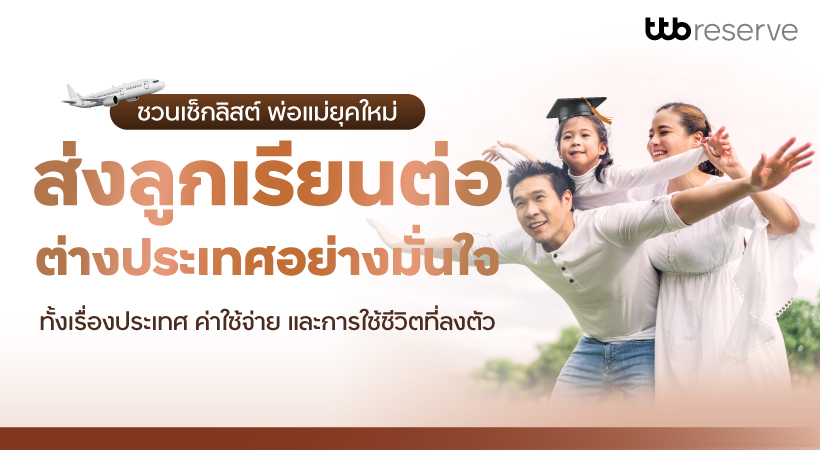 วันนี้ ttb reserve ในฐานะผู้ช่วยวางแผนทางการเงินและต่อยอดความมั่งคั่งครบทุกมิติสู่ความสำเร็จไม่มีสิ้นสุด ขอพาคุณพ่อคุณแม่ยุคใหม่มาดูแนวทางที่สามารถเข้าใจได้ง่าย ๆ ให้การวางแผนเรื่องการเรียนต่อต่างประเทศของลูกเป็นเรื่องที่มีประสิทธิภาพ รวมถึงการเตรียมพร้อมเรื่องค่าใช้จ่ายสำหรับการศึกษาของลูกในอนาคต