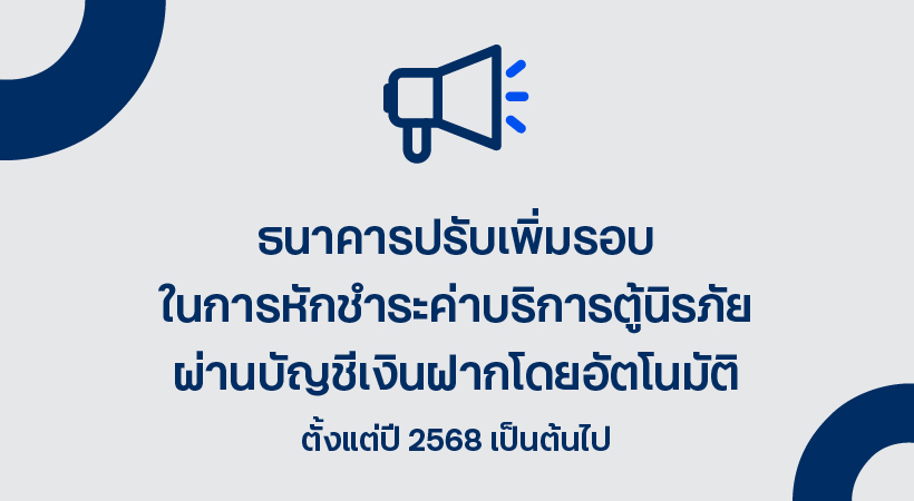 - สำหรับผู้ใช้บริการตู้นิรภัยปัจจุบัน ธนาคารจะหักชำระค่าบริการตู้นิรภัยล่วงหน้าของปี 2569 ในวันที่ 16 ธันวาคม 2568 กรณีที่ไม่สามารถทำรายการได้สำเร็จ ธนาคารจะดำเนินการหักชำระค่าบริการตู้นิรภัยอัตโนมัติ ผ่านบัญชีเงินฝากของผู้ใช้บริการอย่างต่อเนื่องจนกว่าจะสามารถทำรายการได้สำเร็จ