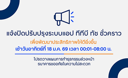 แจ้งยกเว้น ค่าธรรมเนียม สำหรับบัญชี ทีทีบี เบสิก และ บัญชี ทีทีบี กระแสรายวันทั่วไป มีผลตั้งแต่ 1 ม.ค. 69 – 31 ธ.ค. 69
