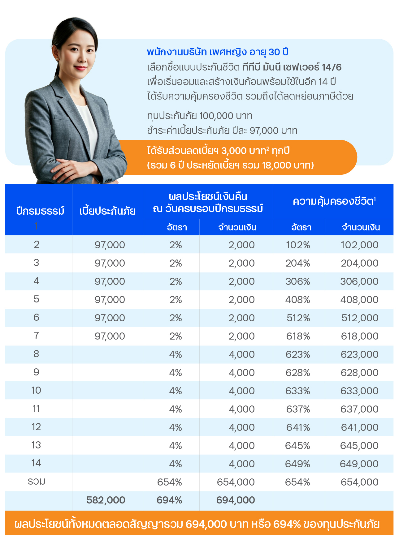 - ผลิตภัณฑ์นี้เป็นผลิตภัณฑ์ประกันชีวิตมิใช่การฝากเงิน เพื่อสิทธิประโยชน์สูงสุดจากกรมธรรม์ ผู้ขอเอาประกันภัยควรชำระเบี้ยประกันภัยจนครบระยะเวลาการชำระเบี้ยฯ และถือครองกรมธรรม์จนครบกำหนดสัญญา หากกรมธรรม์ยุติความคุ้มครองก่อนครบกำหนดสัญญา ผู้ขอเอาประกันภัยอาจไม่ได้รับเงินคืนเท่ากับสิทธิประโยชน์สูงสุดจากกรมธรรม์หรือจำนวนเบี้ยประกันที่ชำระมาแล้ว