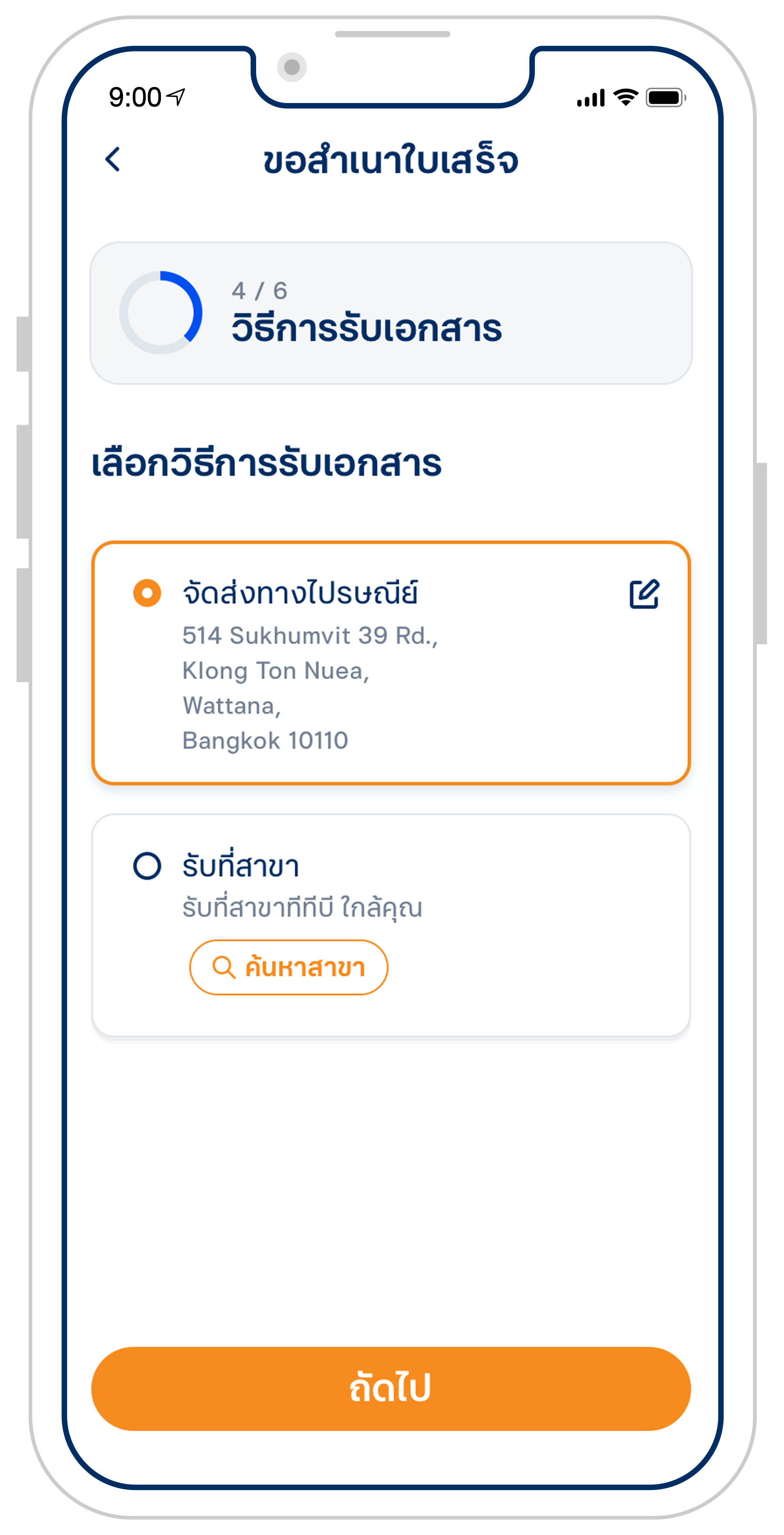 5. เลือกช่องทางในการรับสำเนา ดาวน์โหลดผ่าน ทีทีบี ทัช หรือรับทางไปรษณีย์ จากนั้นเลือก “ถัดไป”