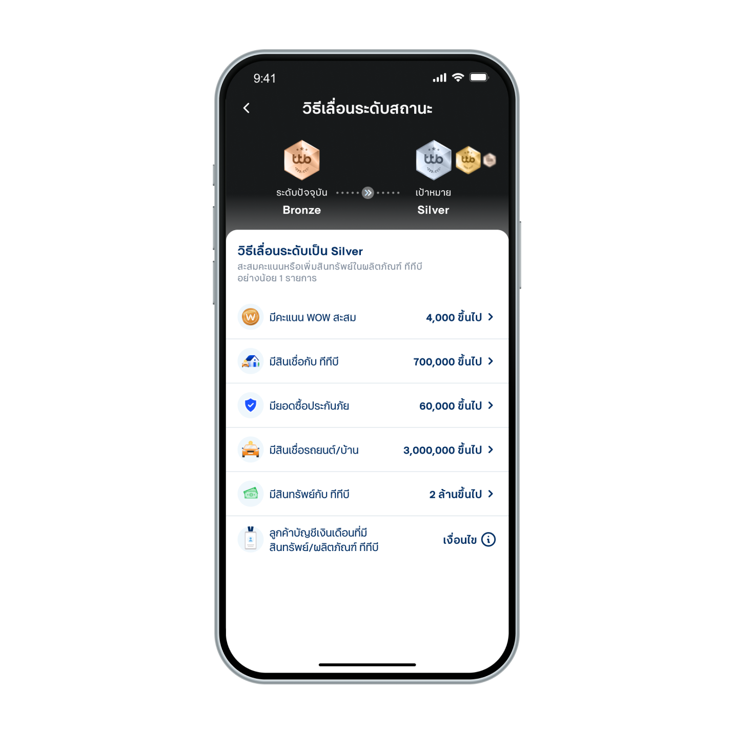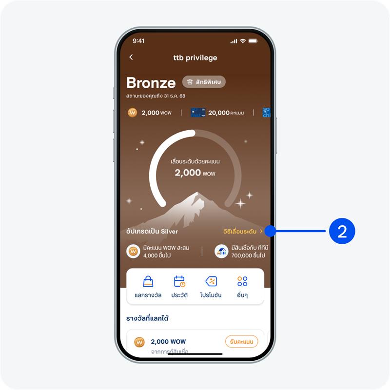 3. ดูวิธีเลื่อนระดับเป็นสถานะถัดไป โดยสะสมคะแนนหรือเพิ่มสินทรัพย์ในผลิตภัณฑ์ของ ทีทีบี