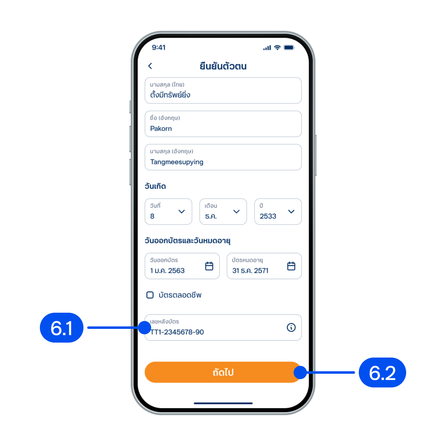 6.1 ใส่เลขหลังบัตรประชาชน และตรวจสอบข้อมูลส่วนตัวให้ถูกต้อง