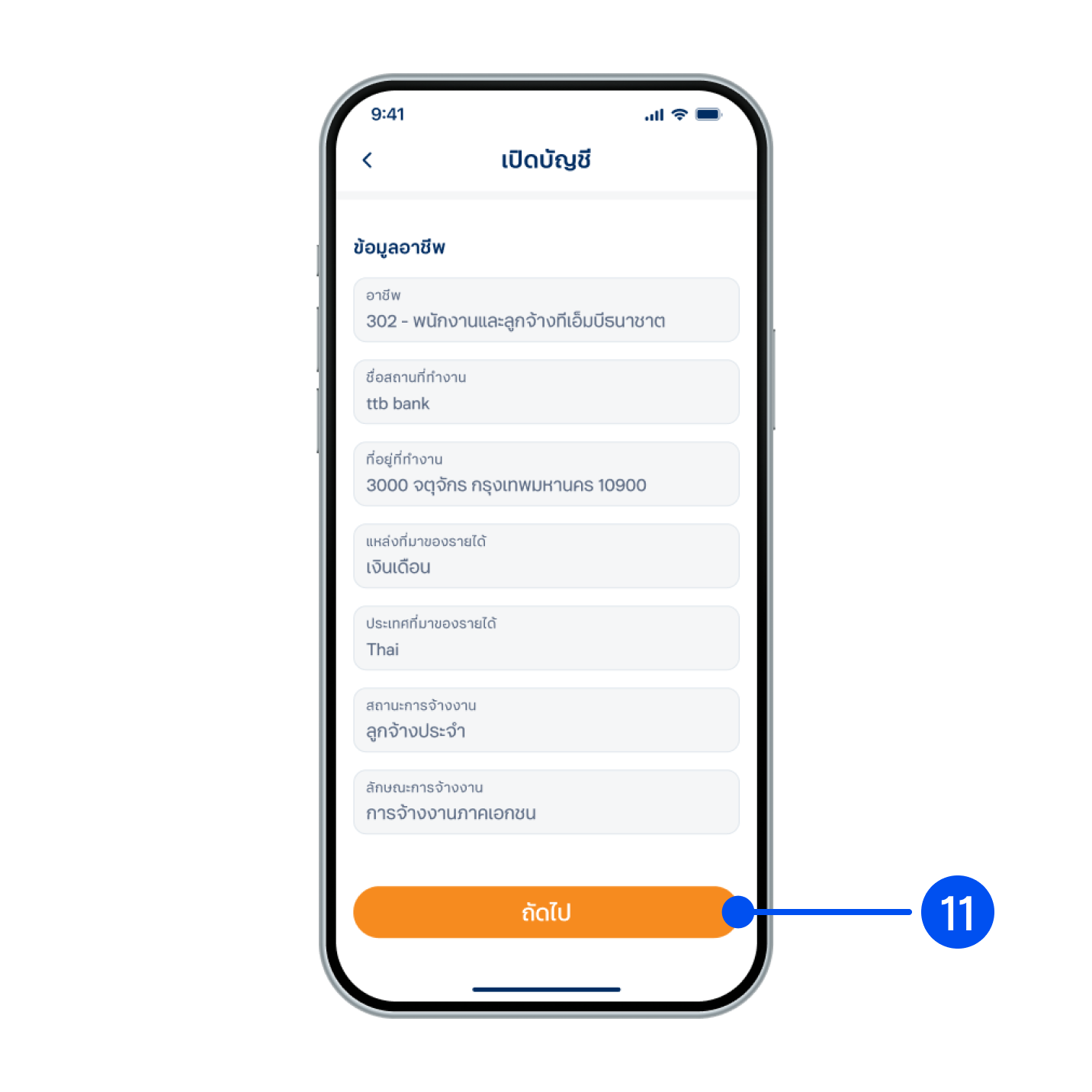 11. ตรวจสอบข้อมูลส่วนตัวและข้อมูลอาชีพให้ถูกต้อง จากนั้นเลือก "ถัดไป"