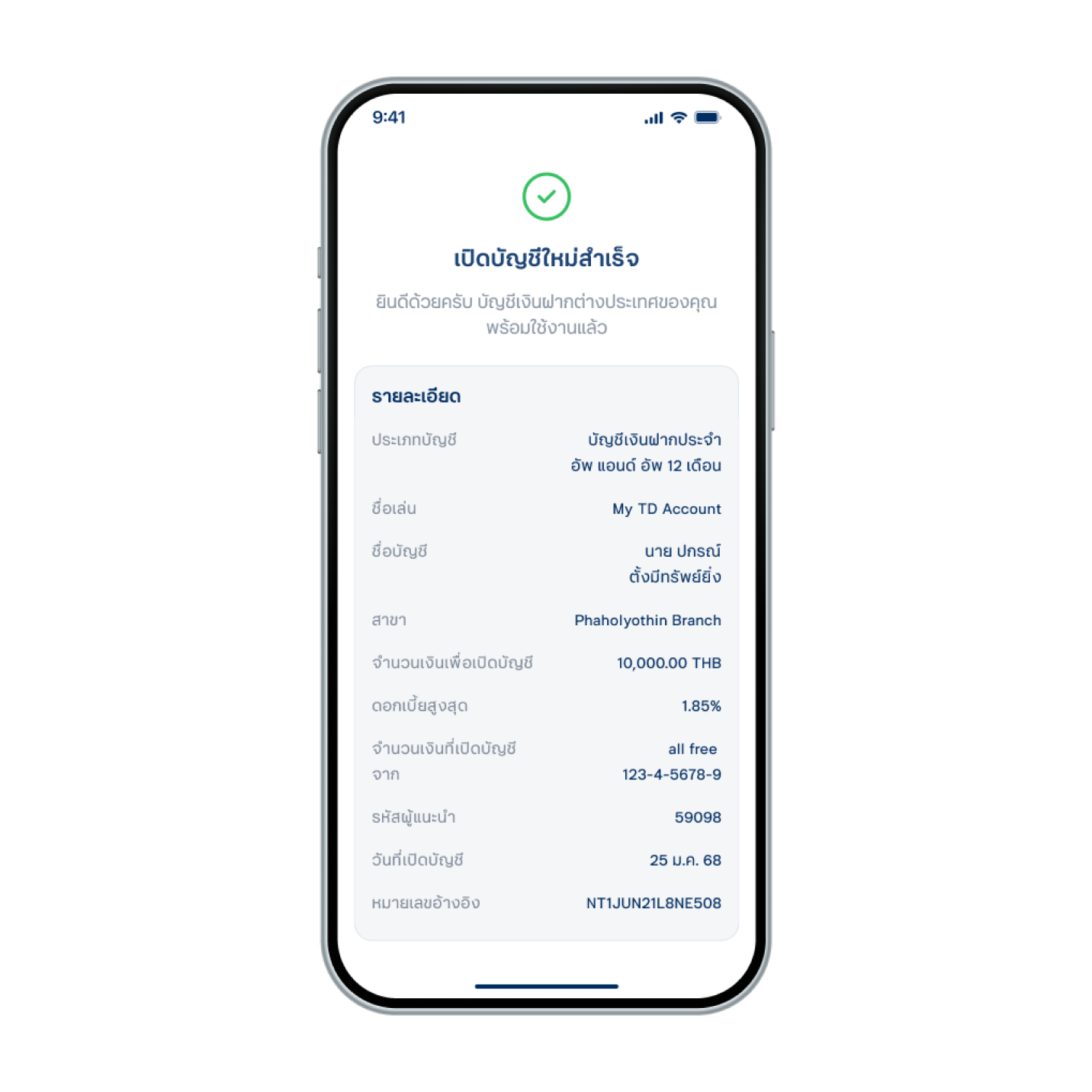 13. ตรวจสอบรายละเอียดบัญชีและข้อมูลการฝากเงิน จากนั้นเลือก “ถัดไป”